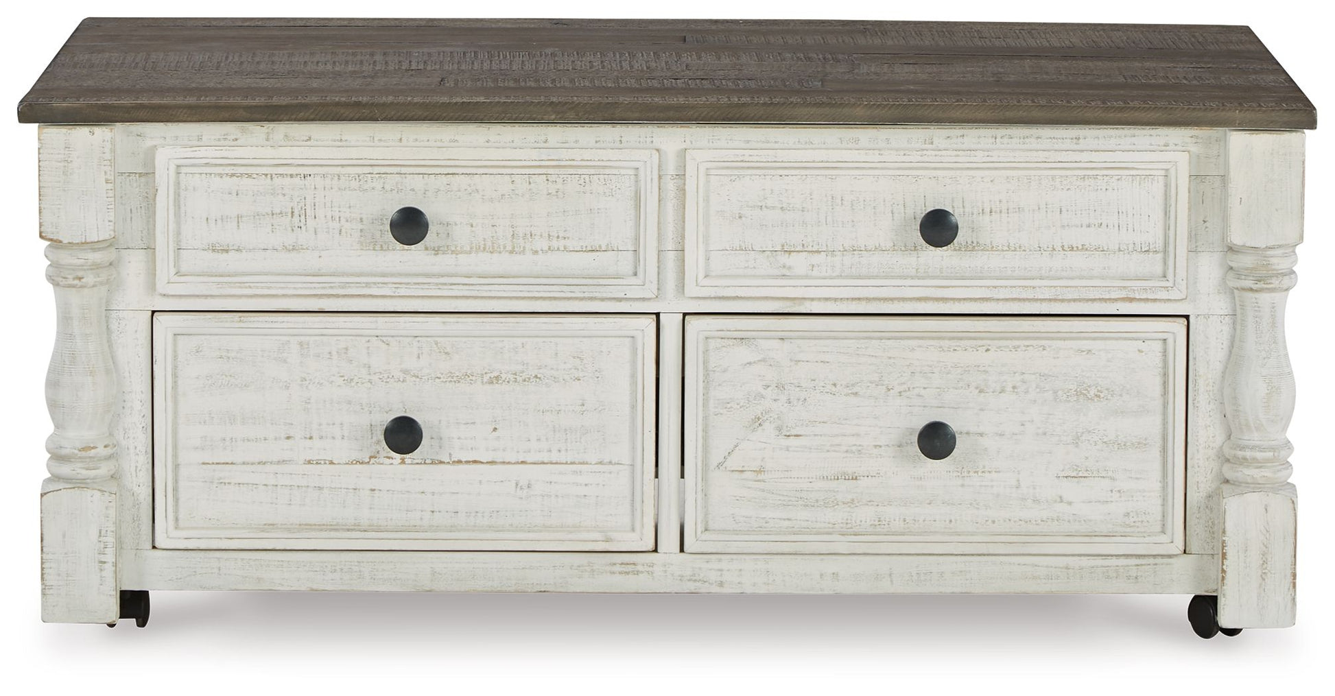 What a fresh interpretation of country classic style. Inspired by American farmhouse craftsmanship, but with an elevated sensibility, this lift-top coffee table blends distinctive details such as turned post accents and raised drawer fronts for a substantial look that feels right at home. Those who appreciate rustic character should take note of the table’s thick crown moulding, beautified with a vintage two-tone finish. It features four storage drawers, a small concealed storage tray under the lift-top, and robust legs that are ready to stand the test of time. And casters allow you to roll it wherever you like.