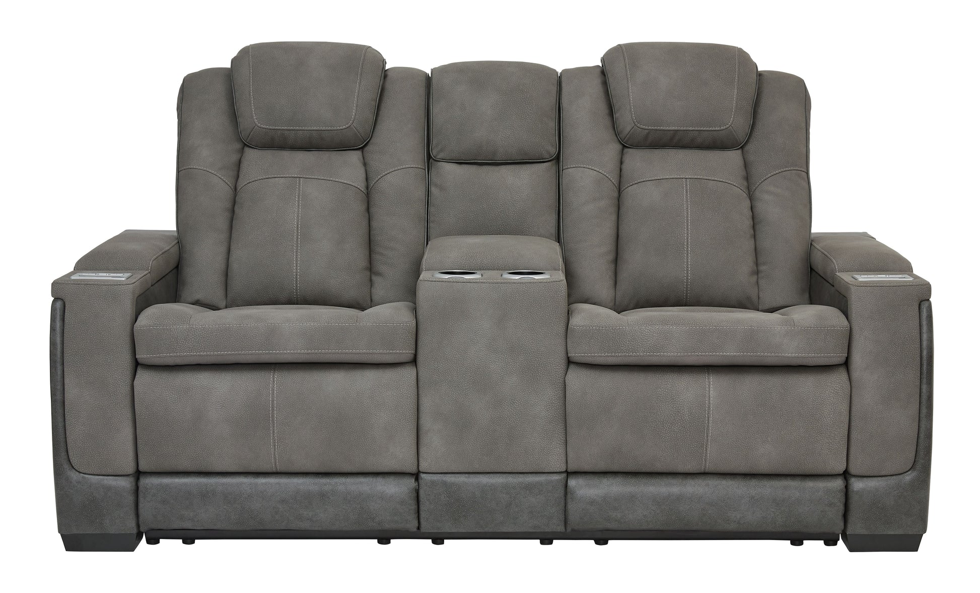 Sleek, ultra-modern power reclining loveseat. Two-tone Durapella upholstery is more durable and water-repellent than regular leather. Includes wireless and USB charging, adjustable headrest and extended "zero-gravity" ottoman.